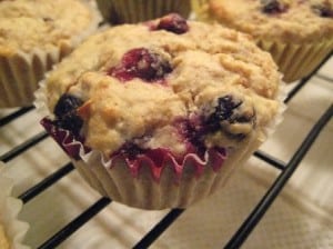3. Dans un autre grand bol, fouetter ensemble la farine, le sucre, la poudre à pâte, le bicarbonate et le sel. Retirer 1 cuillère à soupe des ingrédients secs et mélanger avec les bleuets. Avec une spatule en caoutchouc pliez les ingrédients humides aux ingrédients secs et remuer jusqu’à ce que les ingrédients soient réunis. Incorporer délicatement les bleuets.